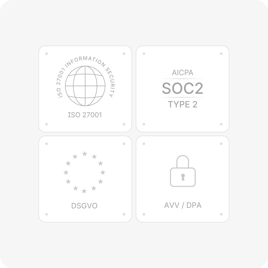 Unternehmensgerechte Compliance und Skalierbarkeit mit Ende-zu-Ende-Verschlüsselung sowie SOC 2 Typ II-, ISO 27001- und DSGVO-Konformität.
